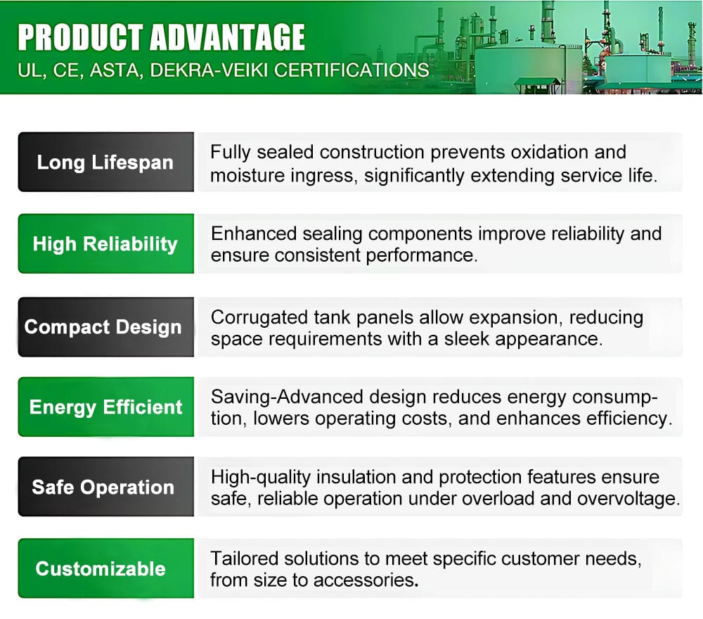 Safety is embedded into every detail. Features like a pressure relief valve, a diaphragm-sealed conservator tank, and durable bushings protect both personnel and equipment. These safeguards ensure reliable operation even under demanding load conditions.