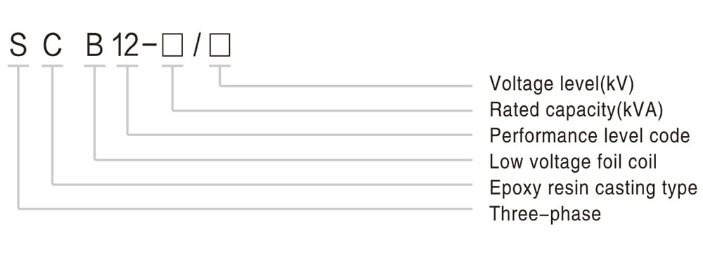 This image explains how the SCB12 10KV Cast Resin Transformer model code is structured, which is something engineers actually care about when selecting equipment. Each letter and number carries a clear technical meaning, not marketing language.