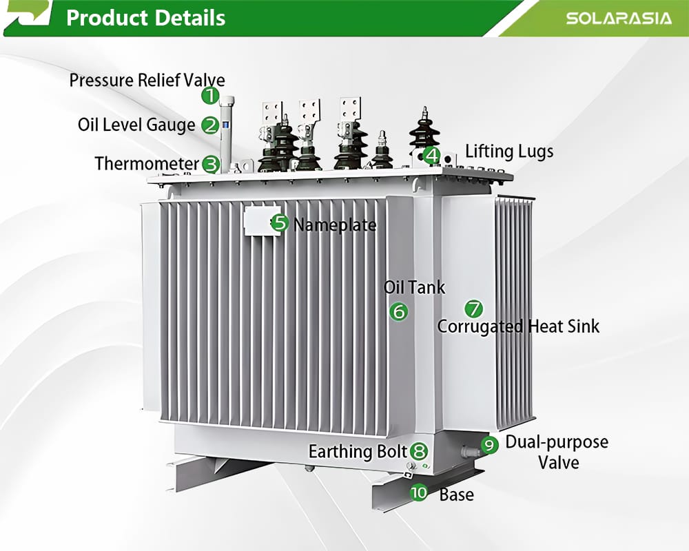 This image presents the Solarasia Energy S11 M 250KVA oil immersed transformer in its standard three-phase configuration. The unit is engineered for stable power delivery in industrial, commercial, and utility distribution networks. Its fully sealed structure prevents moisture ingress and extends service life, while the high-purity transformer insulating oil ensures excellent dielectric strength and heat dissipation.