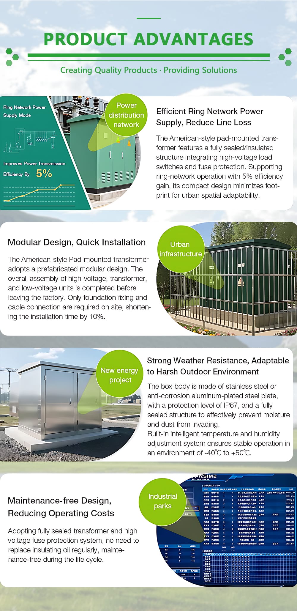 Introducing the industry-leading 1200kVA pad-mounted transformer – a perfect fusion of exceptional performance and elegant design in one complete power solution. This innovative equipment features a fully sealed construction that completely immerses core components including the transformer core, high-voltage load switch, and protective fuses in insulating oil, achieving true “all-insulation, full-sealing” protection. Its high-strength steel enclosure with environmentally friendly coating not only ensures lasting protection in harsh outdoor environments but also maximizes space utilization through compact design, making it the ideal choice for communities, industrial parks, and commercial centers seeking safe and efficient power distribution.