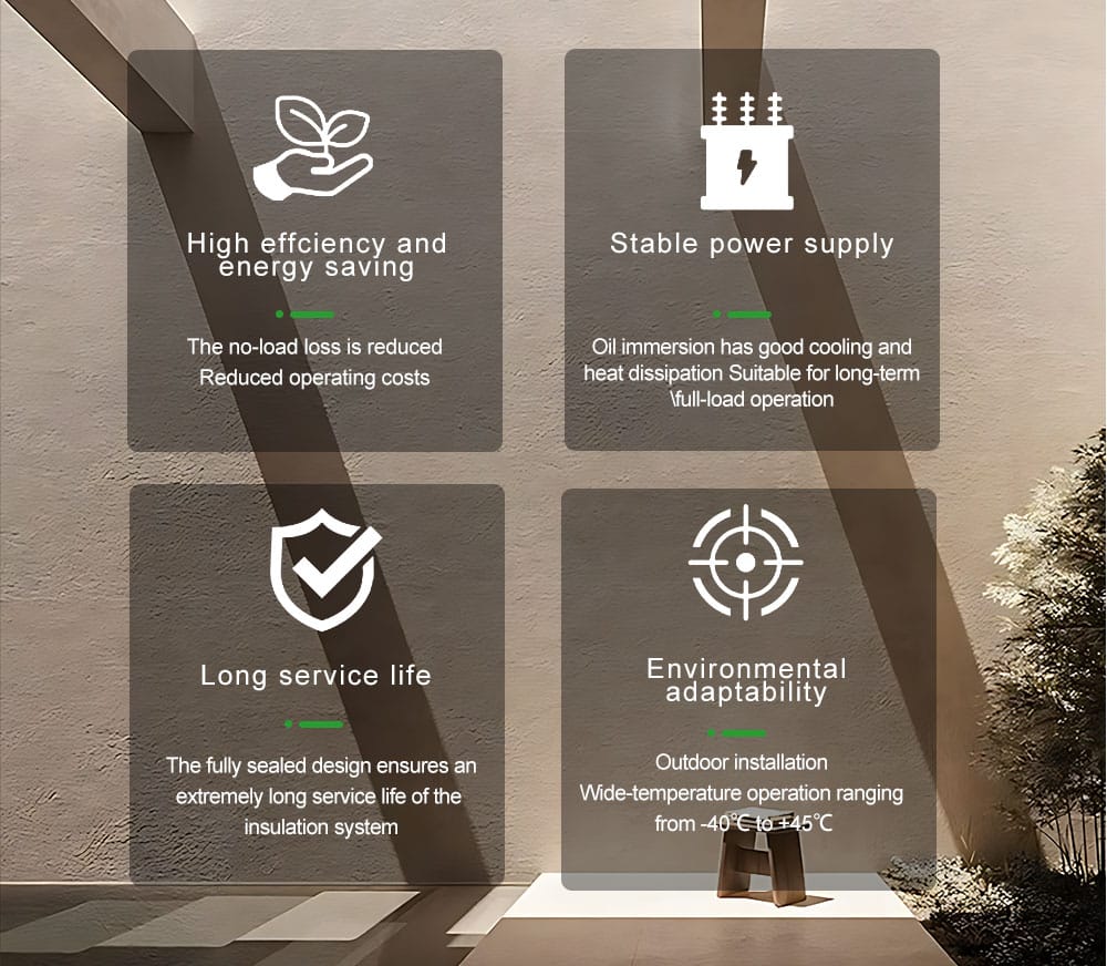 Infographic highlighting the four main advantages of the oil immersed power transformer: High Efficiency, Stable Power Supply, Long Service Life, and Environmental Adaptability.