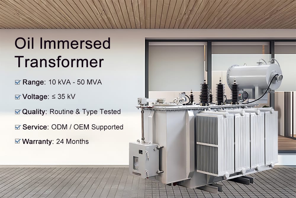 Yes. The 1000KVA oil immersed transformer supports indoor and outdoor installations. Its sealed oil tank structure allows stable operation in substations and outdoor distribution environments under different climate conditions.