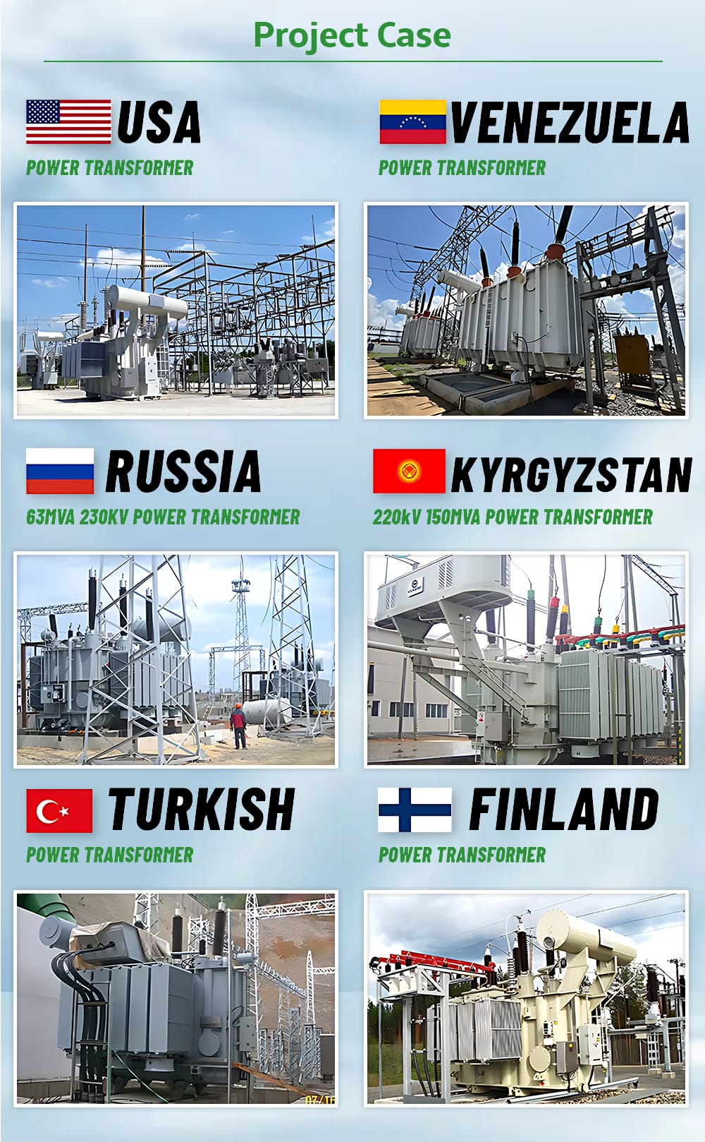 This world map highlights where our 10MVA oil-immersed transformers are operating around the globe. It shows how our products run reliably in different regions and power environments. Each marked country—including the USA, Russia, Turkey, Venezuela, Kyrgyzstan, and Finland—represents a project successfully built to match local grid standards, climate conditions, and performance requirements.