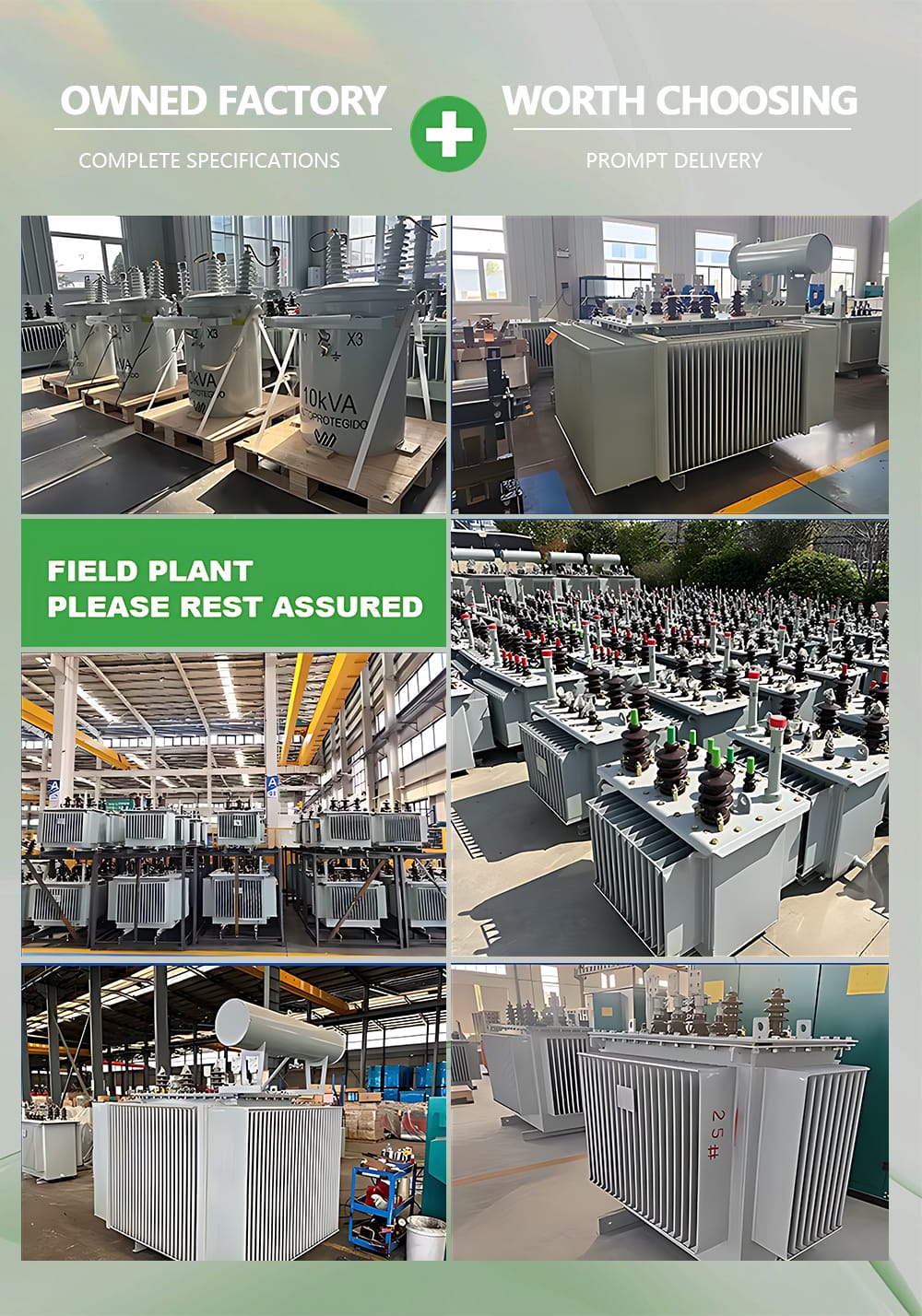 This collage demonstrates the full production capability of the manufacturer, showcasing a well-equipped facility capable of producing oil type transformers across various capacities and voltage levels. The “Owned Factory” section reinforces vertical supply chain control, reducing production lead time and ensuring consistency in quality. “Complete Specifications” reflects the wide product range—from compact distribution transformers to large substation transformers. “Worth Choosing” and “Prompt Delivery” highlight operational efficiency and customer satisfaction.