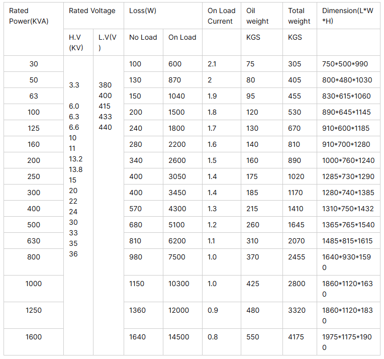 | Rated Capacity (kVA) | Rated Voltage (kV) | Loss (W) | On Load Current (A) | Total Weight (kg) | Dimension (L*W*H) mm | ||