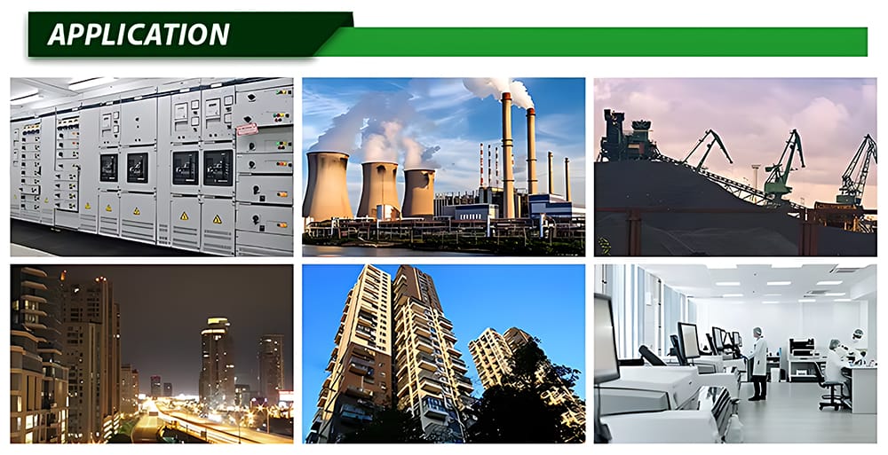 The visual demonstrates its seamless integration into residential areas for community power supply, sensitive laboratory facilities requiring clean and stable electricity, heavy-duty industrial plants with high power demands, and bustling commercial centers like shopping malls and office buildings.
