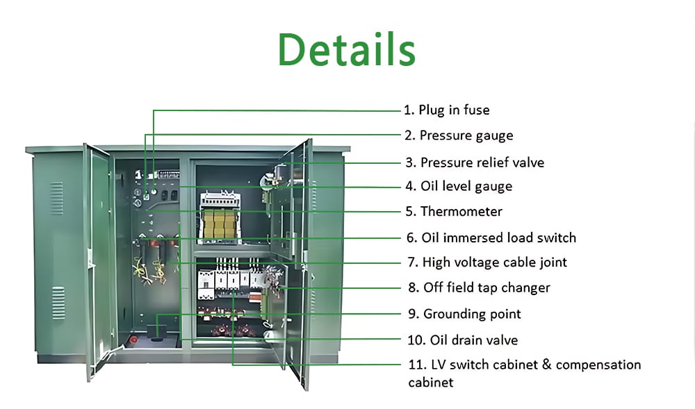 The compact, self-contained design embodies the American-style “all-in-one” philosophy, housing the transformer, high-voltage and low-voltage switchgear, and protective systems within a single, secure structure.